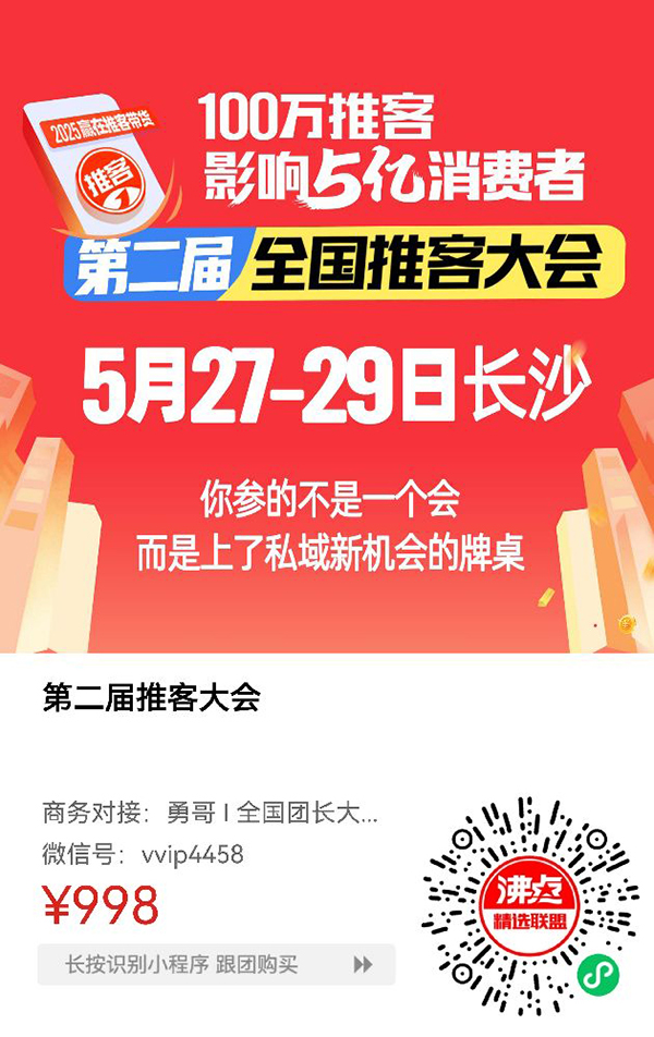 在萬億級微信電商生態的浪潮下,2025年推客經濟迎來爆發式增長!為助力商家及創業者搶占微信小店分傭賽道先機,由沸點會發起的第二屆萬人推客大會暨首屆推客小程序大會將于5月27-29日在長沙盛大召開。這場行業頂級盛會不僅匯聚全國頭部推客小程序服務商,更將打造"工具+供應鏈+方法論"的全鏈路賦能平臺。