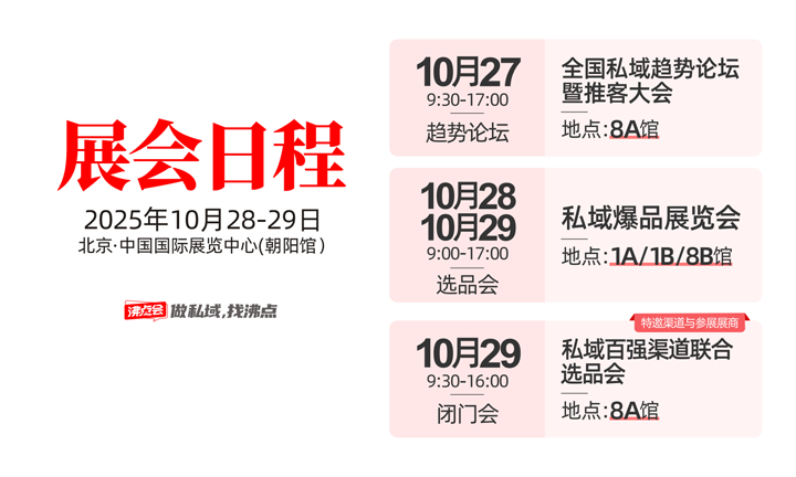 2025 年 10 月 28-29 日北京私域大會暨年貨選品會展位名額有限,98% 私域頭部渠道已就位!如需咨詢預訂、了解品類細則或獲取展位效果圖,可聯系沸點會官方團隊,提前搶占年終增長機會!